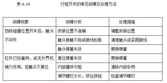 行程開關的常見故障及處理方法,如表4.14所示。